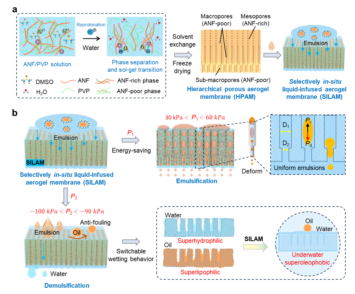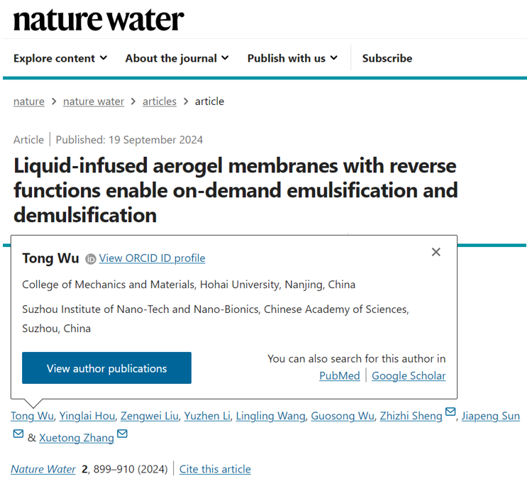 近日,我校材料与化工专业硕士研究生吴桐以第一作者身份在国际期刊《Nature Water》上发表了题为“Liquid-infused aerogel membrane with reverse functions enables on-demand emulsification and demulsification”的研究性论文。中国科学院苏州纳米技术与纳米仿生研究所张学同研究员、盛智芝副研究员和High漫画 孙甲鹏副研究员为论文通讯作者。High漫画 硕士研究生王玲玲和吴国松教授为论文的共同作者。