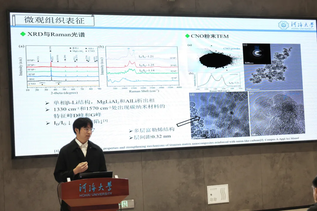 “最佳汇报人”获得者23级硕士研究生徐玉缀进行了主题为“搅拌摩擦加工CNO/LA141镁基复合材料的力学性能和耐腐蚀性能研究”的汇报。他向我们揭示了材料在搅拌摩擦加工中的强化机制,并详细介绍了研究步骤与实验设计,获得了在场评委嘉宾的一致认可。