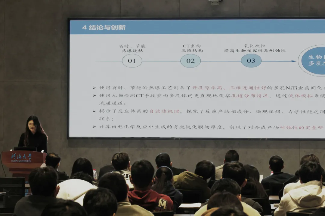 24级博士研究生徐雪薇以“生物医用多孔NiTi合金的热爆法合成与氧化改性研究”为题向大家介绍了热爆烧结的合金制备方法,同时展示了材料在医学领域的应用,为参会者提供了该材料用于实际的新思路。