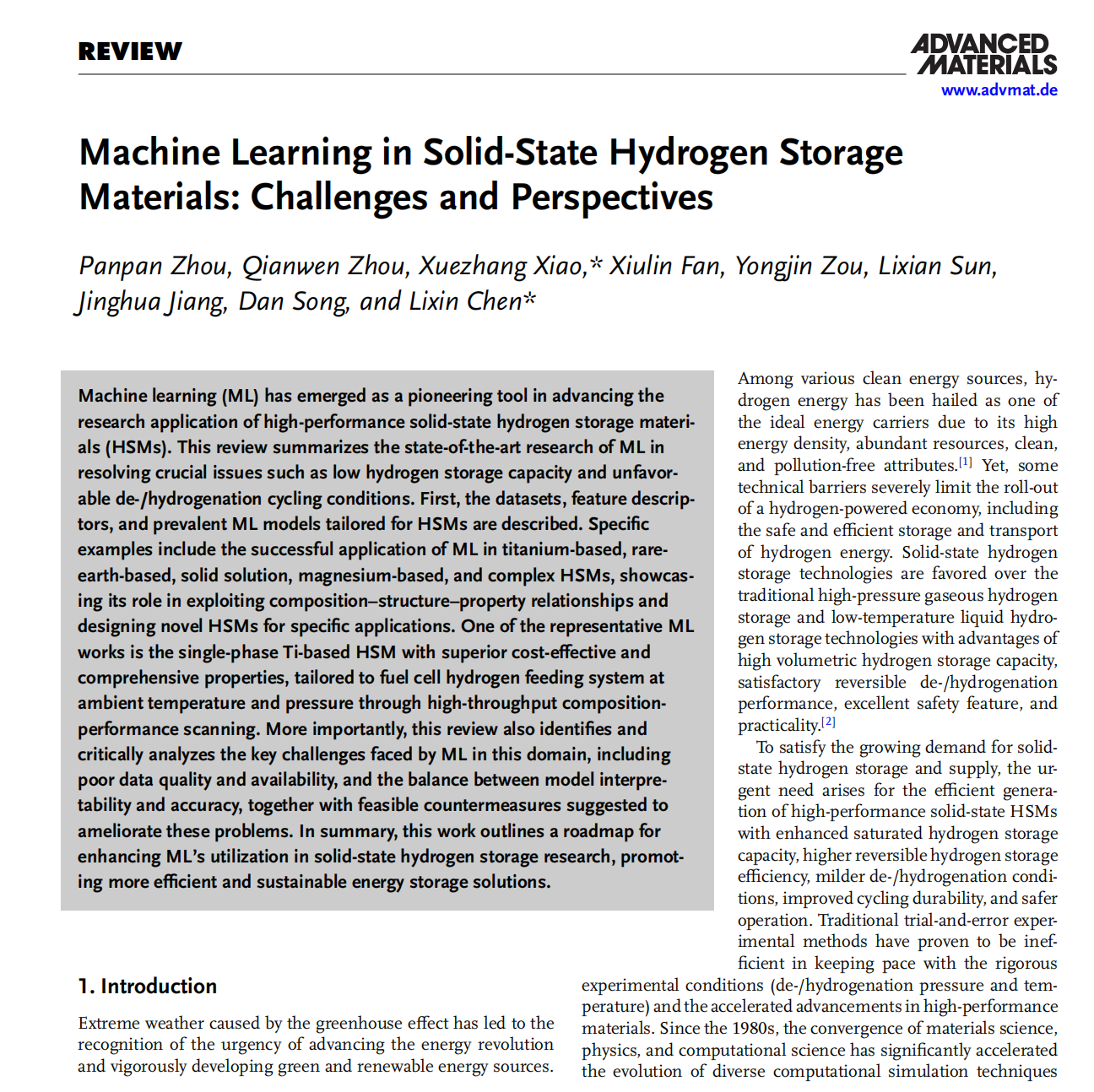 青年教师周盼盼以第一作者身份在材料领域顶级期刊《Advanced Materials》上发表了题为“Machine Learning in Solid-State Hydrogen Storage Materials: Challenges and Perspectives”的综述长文(非邀稿),High漫画