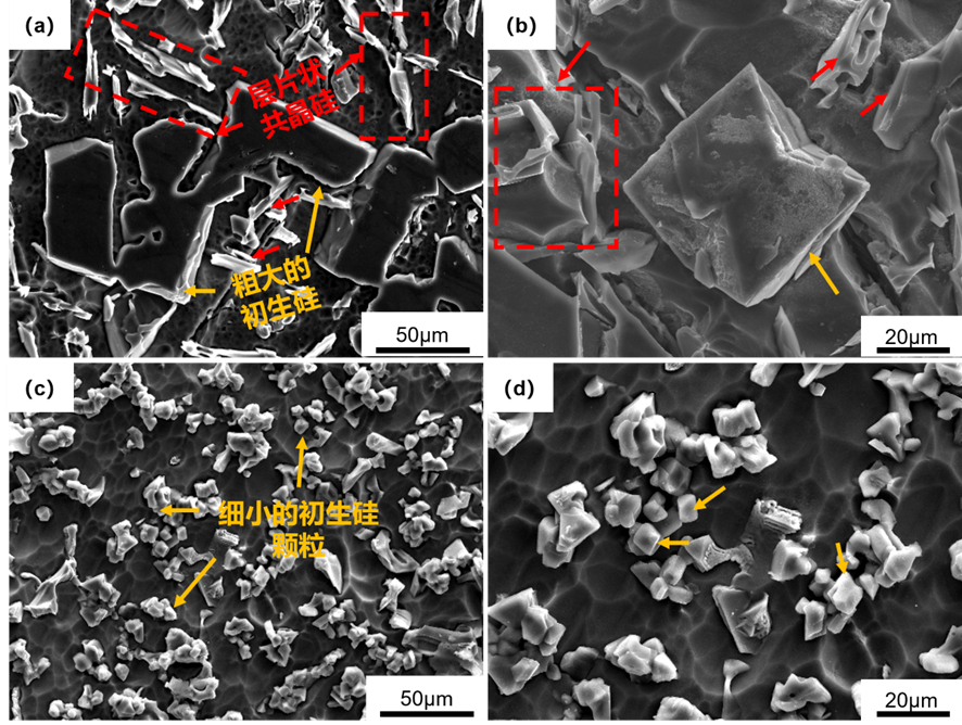 不同铸造方法制备的A390合金深腐蚀SEM显微组织:(a, b) 常规金属型铸造(组织为粗大的初生硅和层片状共晶硅);(c, d) 玻璃管吸铸(组织为细小硅颗粒)