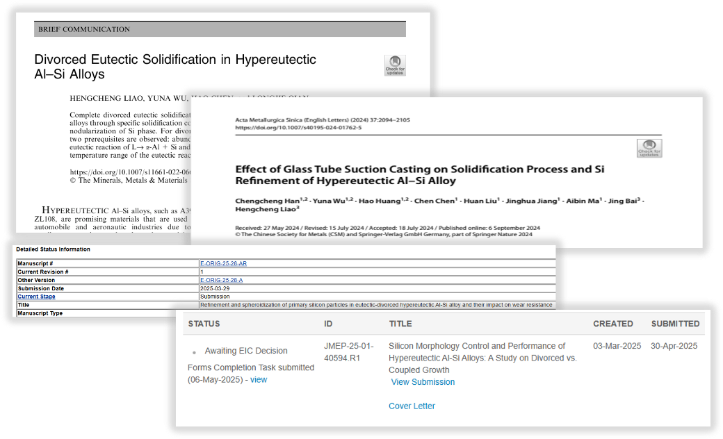 过共晶铝硅合金凭借其卓越的铸造性能、低热膨胀系数、优异的耐磨性及导热特性,已成为发动机关键部件、新能源汽车动力电池散热系统及高密度电子封装等领域重点研发的轻量化材料。然而,该材料显微组织中存在的粗大初生硅与层片状共晶硅相严重制约了其综合性能表现:初生硅(典型形貌包括八面体、板片状及五瓣星形)尖锐棱角处易产生应力集中效应,诱发基体割裂并最终导致构件失效;共晶硅与α-Al相的耦合生长不仅破坏组织连续性(延伸率降幅超过50%),同时形成自由电子和声子的迁移屏障,致使导热/导电性能显著衰减(降幅达30%-40%)。这一系列关键科学问题已成为制约高硅铝合金在高端制造领域规模化应用的核心障碍。为响应国家高性能金属材料发展战略需求,推动该材料在航空航天装备、新能源汽车及先进电子器件等战略领域的深度应用,亟需构建创新性的硅相调控技术体系,从而实现高硅铝合金力学与热学性能的协同提升。