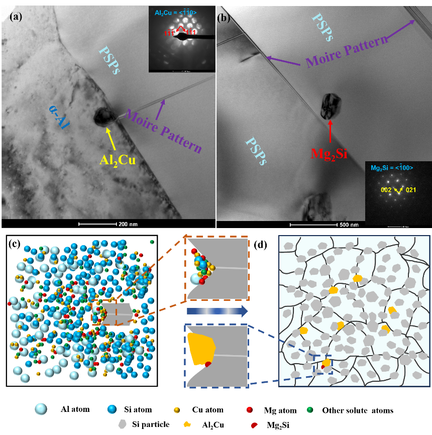 在探究PSPs细化机制的过程,本团队提出了如图3所示的溶质原子限制PSPs生长的机制:(1) 溶质原子容易钉扎在PSPs的生长前沿, 限制PSPs的生长;(2) 溶质原子会与剩余熔体中的Si原子形成金属间化合物,消耗Si原子,从而阻碍了更多的Si原子扩散至PSPs表面沉积,细化了PSPs。相关成果发表在: Acta Metall. Sin. Eng-Lett. 2024, 37(12): 2094-2105.